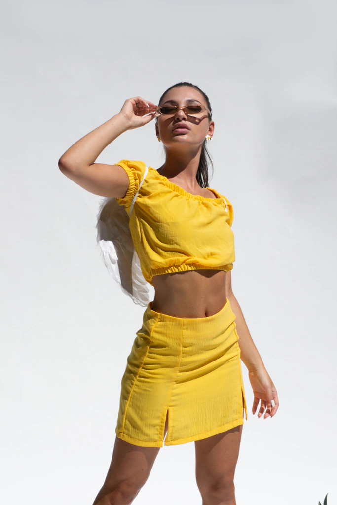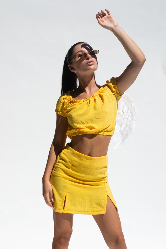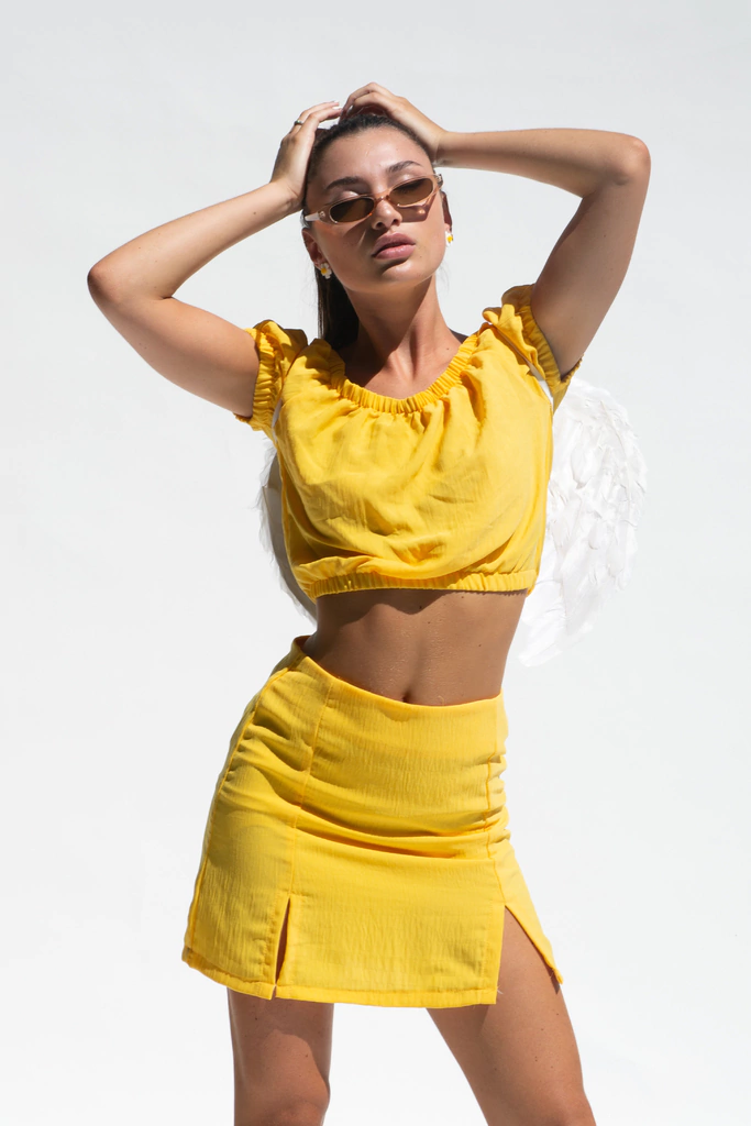 La Pollera Edith Amarilla es la prenda ideal para aquellas que desean resaltar su feminidad con un toque de originalidad. Esta pollera corta, súper liviana, presenta tajos en el frente que aportan un aire de sensualidad y frescura a tu look.